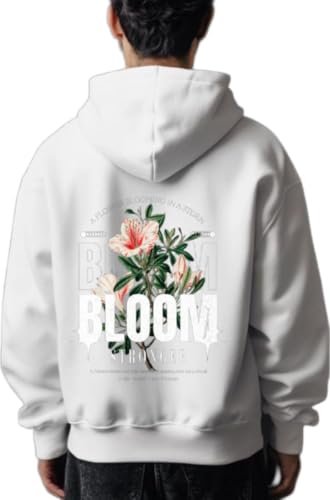 Generic - سويت شيرت كبير بغطاء للرأس للشباب بعمل خاص عبارة عن رسمة فنية ونص كبير الحجم من الخلف bloom مع أزهار،نمط 64، لون أبيض