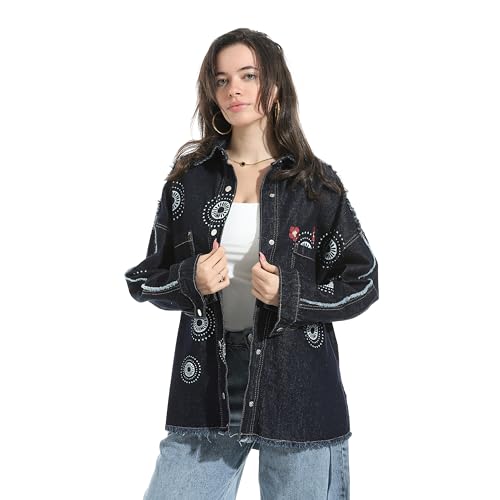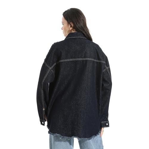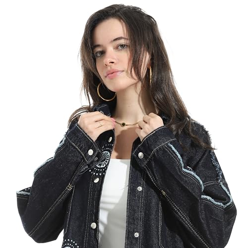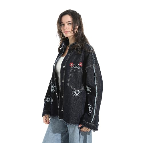 Coctail - جاكيت دينيم كبير المقاس بتصميم مطرز بأطراف شراشيب وأزرار في الأمام 17378، أزرق (Blue Black)