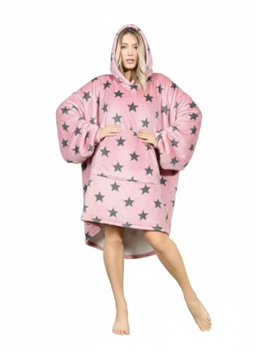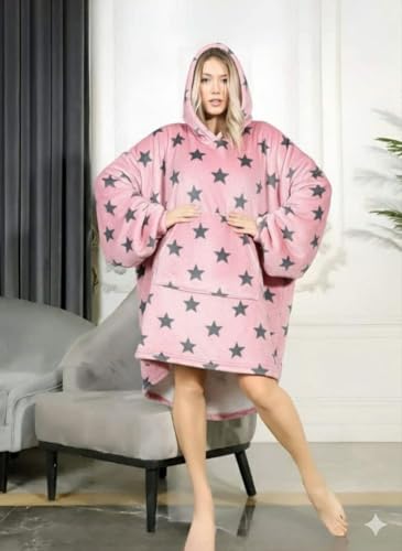 Generic - بطانية هودي كبيرة الحجم قابلة للارتداء، بينك مع نمط نجوم رمادية، صوف مخملي