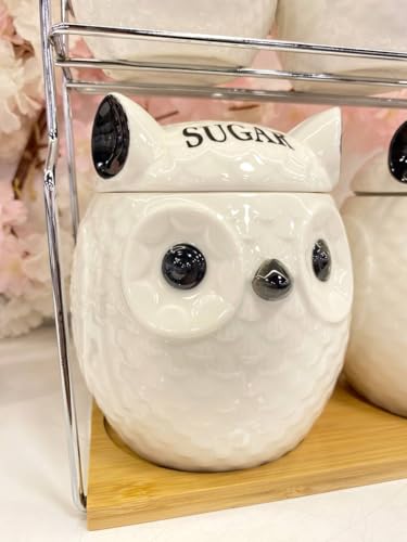 Generic - طقم أواني تخزين المطبخ على شكل بومة، ٧ قطع سيراميك أبيض، حامل معدني، لتخزين التوابل والسكر والشاي والقهوة