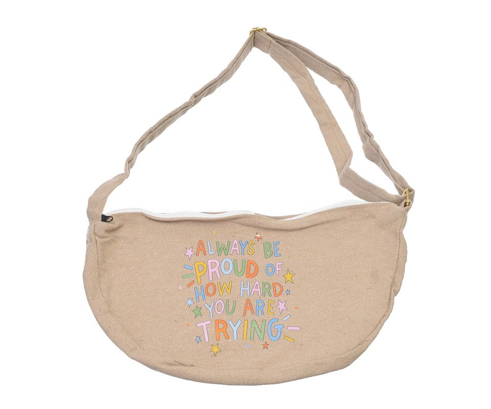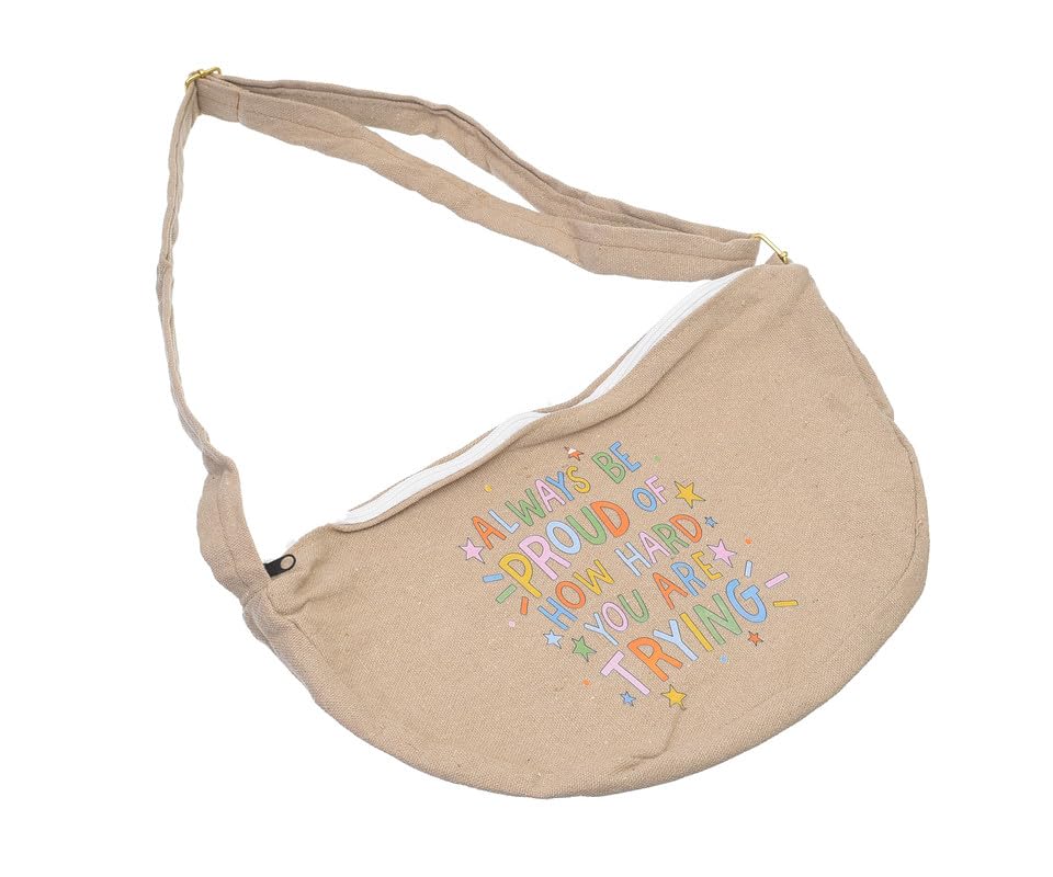 OX - شنطة خصر قماشية موضة مطبوع عليها عبارات هزلية مع سوستة للنساء من او اكس، لون بيج، W-71
