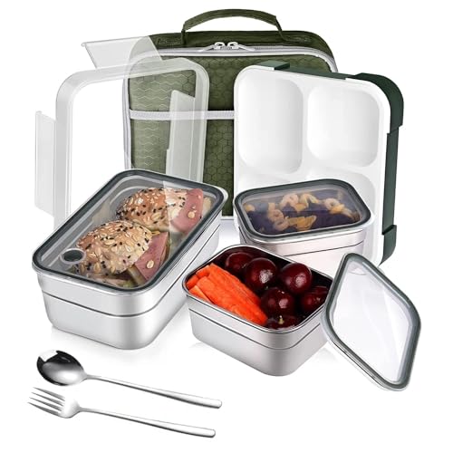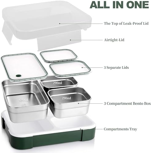 oydas - لانش بوكس بينتو من الفولاذ المقاوم للصدأ مقاوم للتسرب بـ 3 أقسام بسعة 720 مل و1.260 ل خالي من مادة البيسفينول أ، علبة طعام للوجبات الخفيفة للنزهات في الأماكن الخارجية من اويداس، (أخضر، 1.260 ل)