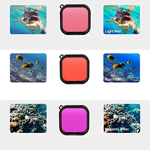 - تم تصميم الفلتر الأحمر الفاتح لتصحيح اللون للعمق الضحل من 0.6 متر إلى 4.5 متر. فلتر اللون الأحمر مخصص للمياه الاستوائية أو الزرقاء بعمق من 4.5 متر إلى 26 متر. يساعد اللون الأرجواني الفاتح في تصحيح اللون الأخضر للعمق من 2.5 متر إلى 23 متر لبحيرات وخزانات المياه العذبة