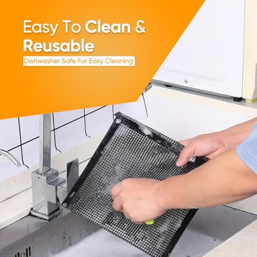 - مادة فاخرة - أكياس الشواء الشبكية الخاصة بنا مصنوعة من مادة الألياف الزجاجية المتقدمة تقنيًا المقاومة للحرارة. هذه الأكياس غير سامة وعديمة الرائحة وغير لاصقة وقابلة لإعادة الاستخدام. مصممة لتحمل درجات الحرارة العالية مثل 500 درجة فهرنهايت (260 درجة مئوية)، يمكن تسخين كل من الكيس الشبكي وبساط الشواء بأمان.