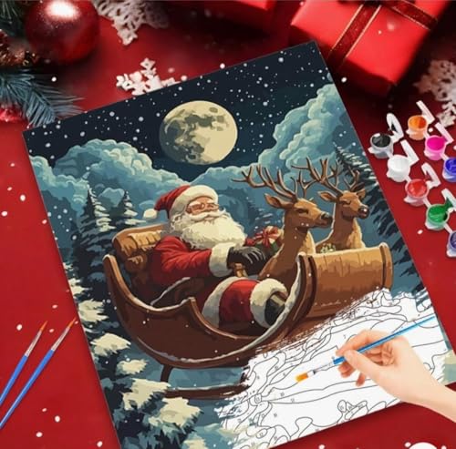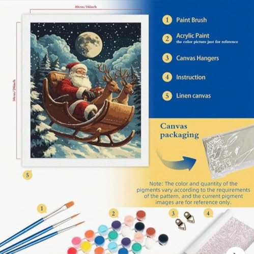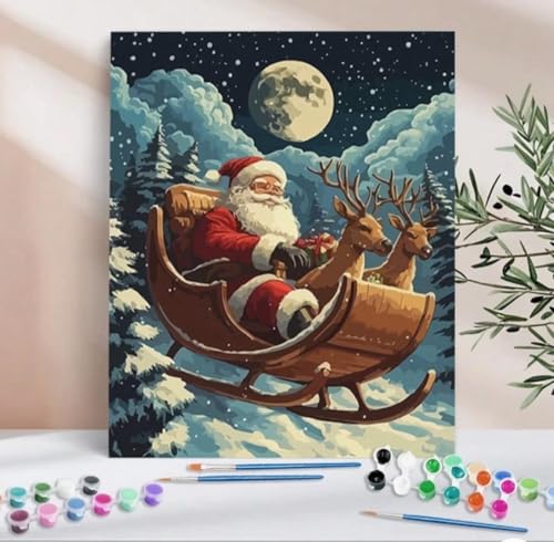 Generic - مجموعة التلوين بالأرقام متكاملة بتصميم مشهد مزلجة ليلة الكريسماس بطابع العطلات الشتوية تتضمن ألوان أكريليك ولوحة قماش 40 × 50 سم وفرش مناسبة للكبار