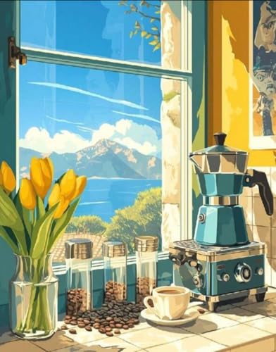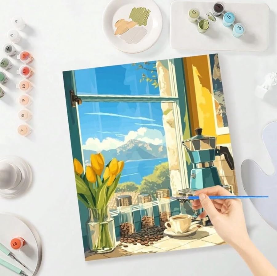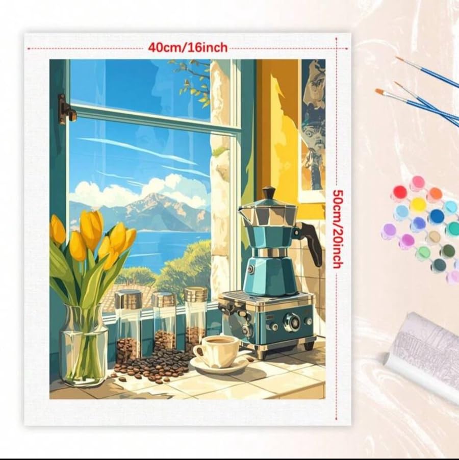 Generic - مجموعة رسم بالارقام، قهوة مع منظر، 40 × 50 سم، مجموعة فنية كاملة مع فرش والوان