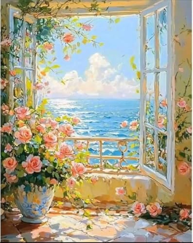 Generic - مجموعة الرسم بالارقام، منظر المحيط مع الورود، قماش 40 × 50 سم، مجموعة فنية كاملة يمكنك صنعها بنفسك مع فرش وطلاء