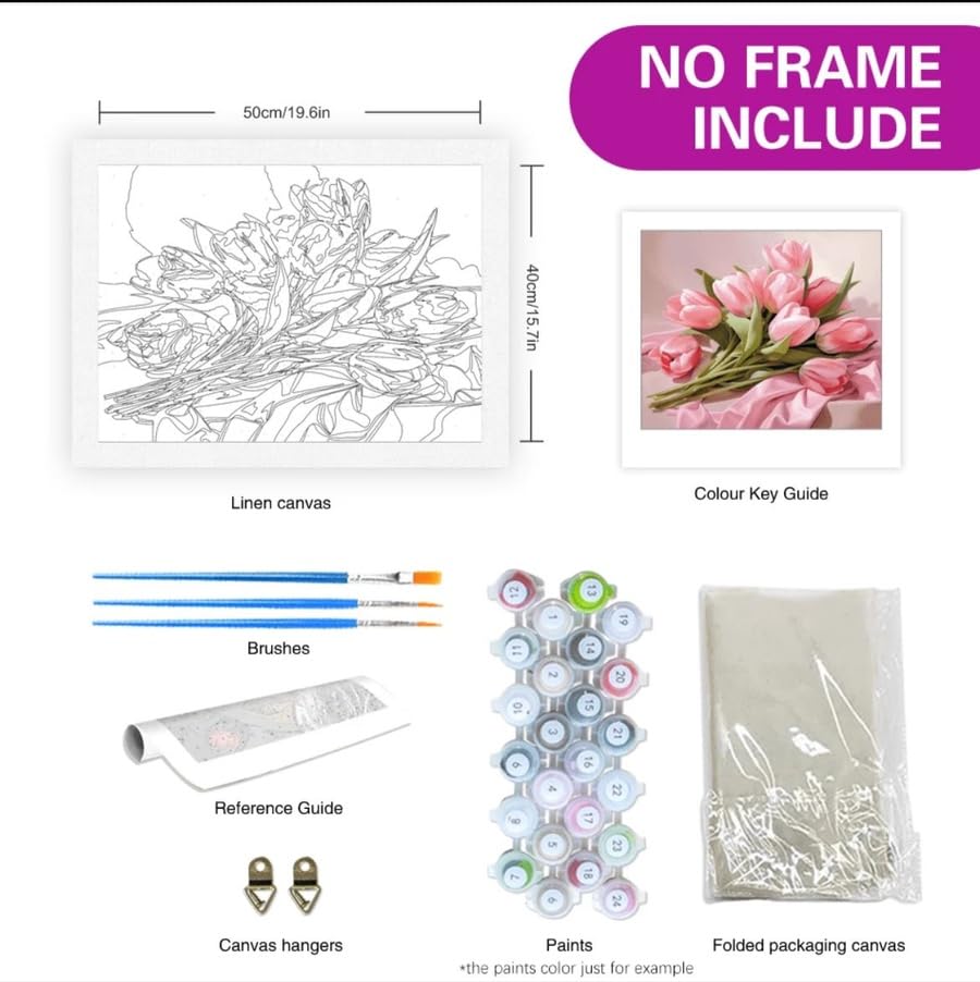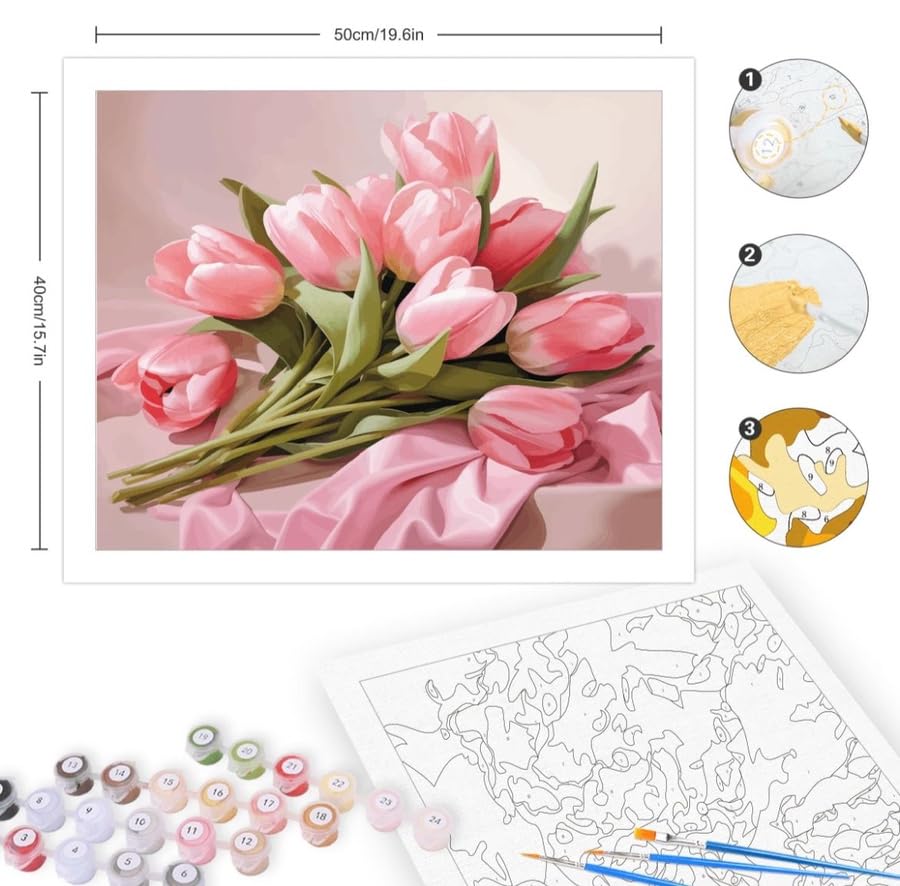 Generic - مجموعة الرسم حسب الارقام، باقة زهور التيوليب الوردية، قماش 40 × 50 سم، مجموعة فنية كاملة يمكنك صنعها بنفسك مع فرش وطلاء