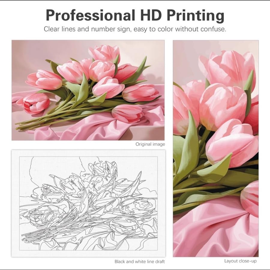 - مزايا التصميم: عمل فني جميل على شكل باقة زهور التوليب الوردية مع أقسام مرقمة، مثالية لخلق تحفة فنية مذهلة من الزهور