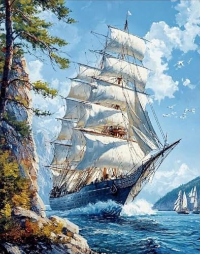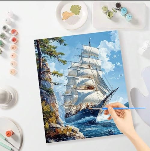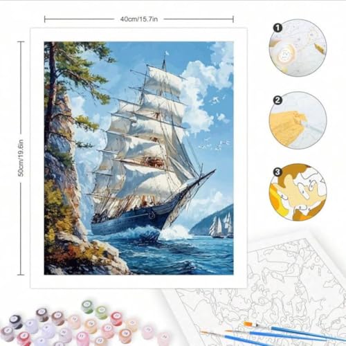 Generic - لوحة فنية قماش من الكتان للرسم بالأرقام للبالغين، لمناظر بحرية وسفينة شراعية، ألوان أكريليك يدوي مع فرش ودهانات، وطقم تعليق بطابع بحري، مقاس 40×50 سم