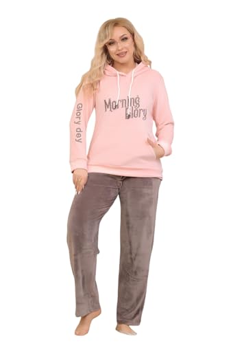Generic - طقم بيجامة للنساء، مخملي، قطعتين بنطلون وسويت شيرت بغطاء للرأس مع تطريز نصي