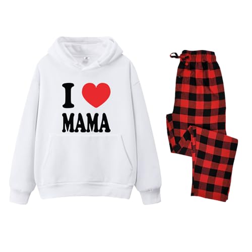 Generic - طقم بيجامة بغطاء رأس ابيض مع طباعة اي لوف ماما، سروال احمر منقوش، قطعتين موضوع عيد الام مقاس (M)