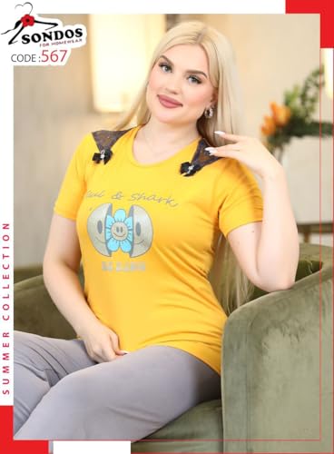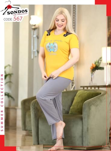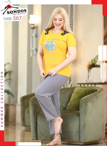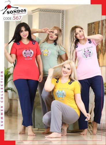 SONDOS FOR HOMEWEAR - بيجامة نسائية قطن ليكرا بطبعة عصرية – من مصنع سندوس – تلبيس من 60 إلى 90 كجم