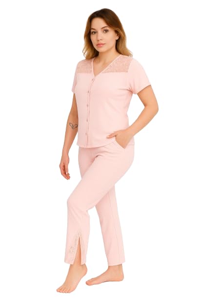 Dadoush - بيجامة حريمي - طقم بيجامة حريمي صيفي مكون من قطعتين بنطلون وتيشرت - طقم بجامة قطن مطرزة للنساء - بيجامة قطن حريمي صيفي زراير - بيجامة صيفي كاجوال قطعتين