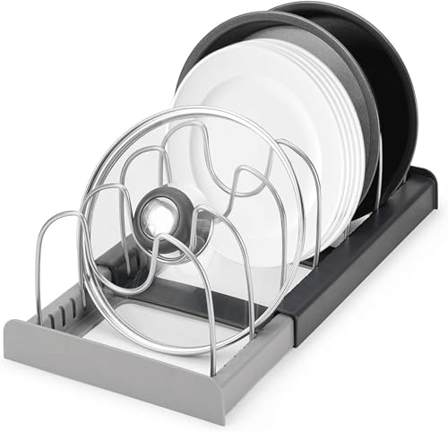 generic - منظم اغطية المقالي والاواني - رف منظم للاواني والمقالي قابل للتوسيع، حامل اغطية الاواني مع 10 اجزاء قابلة للتعديل، منظم من الستانلس ستيل لخزانة المطبخ ورفوف التخزين المعلقة (اسود رمادي)