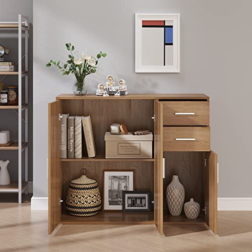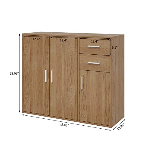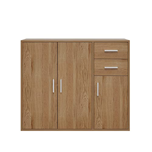 Panana - خزانة جانبية بـ 3 أبواب ودرجين للتخزين من بانانا، بوفيه وطاولة تقديم الطعام وخزانة المطبخ ورف عرض 1 متر (طول) × 35.5 سم (عرض) × 83 سم (ارتفاع) (بلوط)، بني