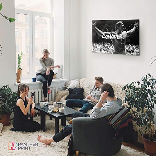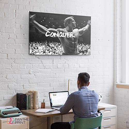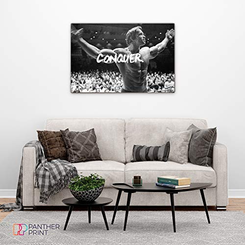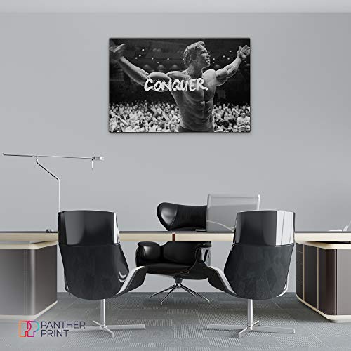 Panther Print - لوحة فنية جدارية كبيرة من القماش بطباعة عالية الجودة وتصميم تحفيزي لارنولد شوارزنيجر بعبارة «Conquer» بانثر برينت لديكور الحائط والمناسبات الخاصة 30 × 20 بوصة رمادي