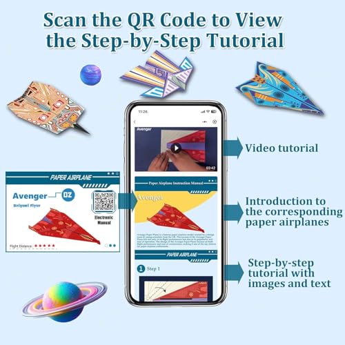 - صادر تعليمية شاملة: امسح رمز الاستجابة السريعة (QR) لرؤية مقدمة مفصلة لكل طائرة ورقية وأدلة خطوة بخطوة ومقاطع فيديو تعليمية لكل تصميم طائرة ورقية (استخدام اللغة العربية غير مؤكد). تعليمات واضحة (استخدام اللغة العربية غير مؤكد)، معززة بوسائل إيضاح بصرية وعروض فيديو تجعل عملية الطي أسهل وأكثر متعة لجميع مستويات المهارة.