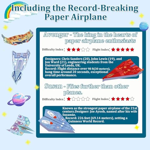 - تقدم مجموعة متنوعة من التصاميم: تتضمن 16 تصميمًا كلاسيكيًا للطائرات الورقية من جميع أنحاء العالم و32 ورقة ملونة قابلة للطي (2 من كل نمط). تتضمن نماذج طائرات حققت أرقامًا قياسية في الطيران مثل "سوزان" و"أفينجر". تُعد هذه العدة بداية رائعة للأطفال الذين يرغبون في التعرف على فن طي الورق الأوريجامي.
