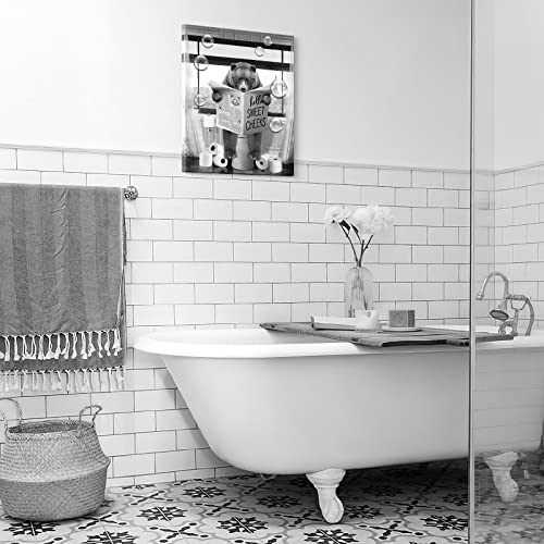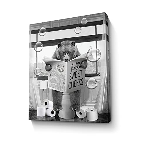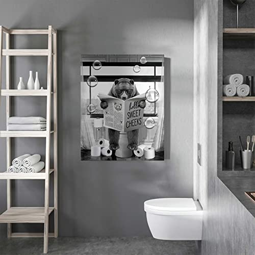 Parylore - لوحة فنية جدارية بتصميم دب مضحك باللونين الاسود والابيض من باريلور ديكور حائط جالس في المرحاض مؤطرة للمرحاض والحمام مقاس 12 × 16 انش