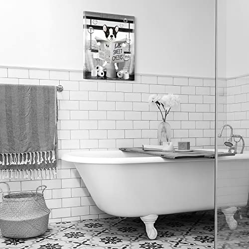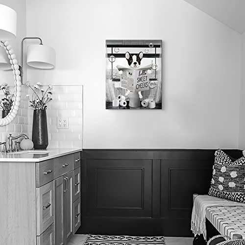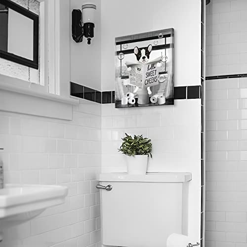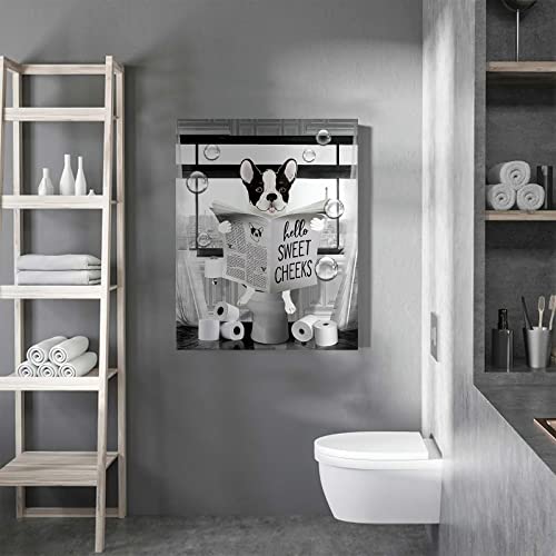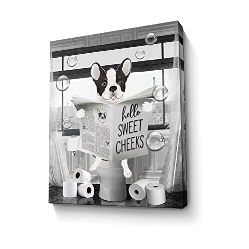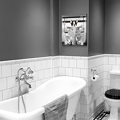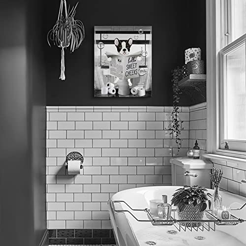 Parylore - لوحة فنية جدارية مضحكة بتصميم كلب بولدوج باللونين الاسود والابيض من باريلور مطبوع عليها حيوانات المزرعة والحمام ديكور حائط يجلس في المرحاض مؤطرة للمرحاض 12 × 16 انش متعدد الألوان