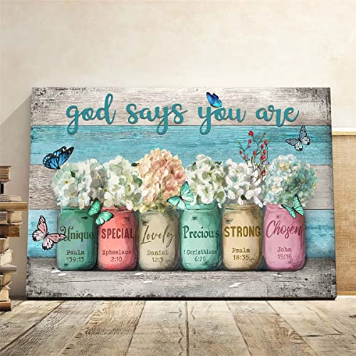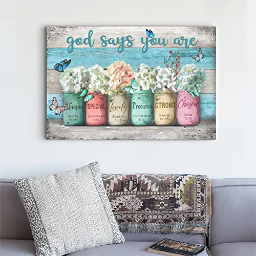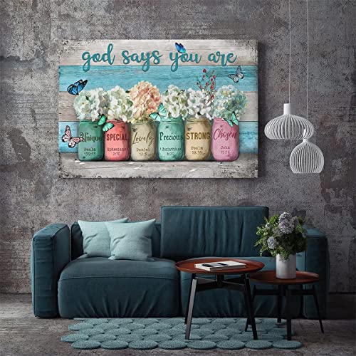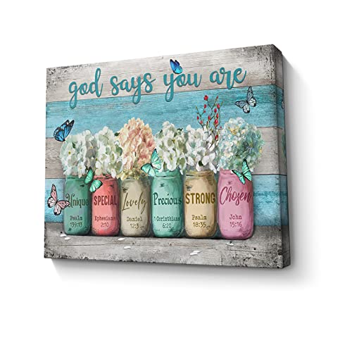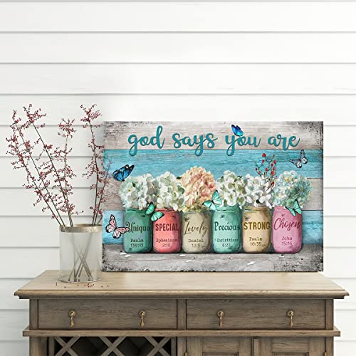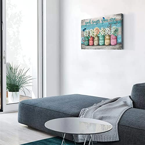 Parylore - لوحة فنية جدارية قماشية بايات ملهمة من مطبوعة الكتاب المقدس على برطمانات ماسون بعبارة «God Says You Are» بلون ازرق مخضر لغرفة المعيشة وغرفة النوم والحمام والمكتب وديكور المنزل، 16×20 بوصة