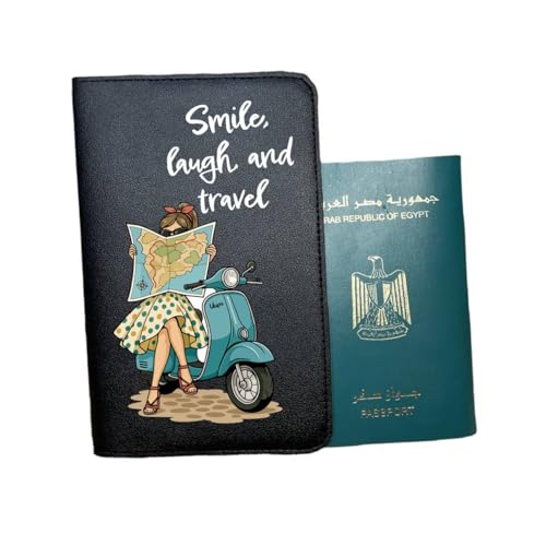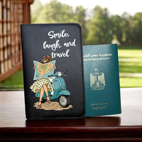 Generic - غطاء جواز السفر - جلد صناعي - اسود - طباعة على جانب واحد - اقتباس باللغة الإنجليزية - ابتسامة وضحك وسفر، نحن نطبع هديتك