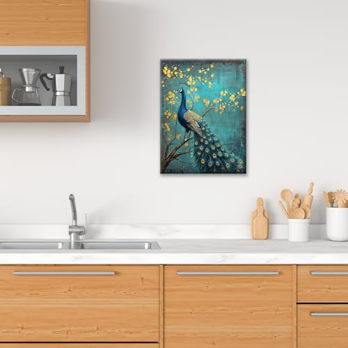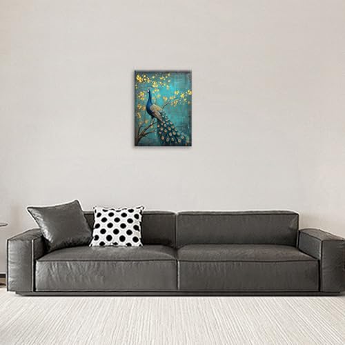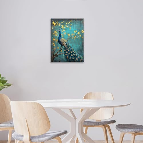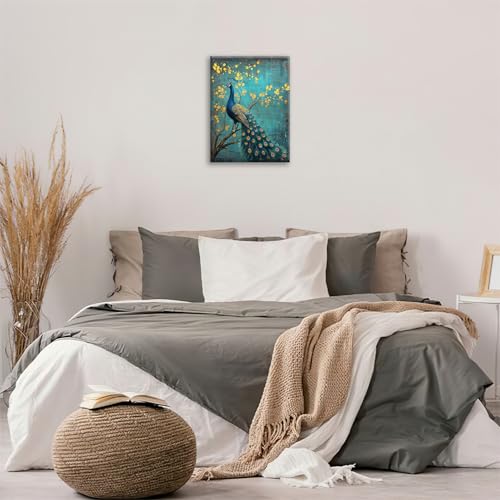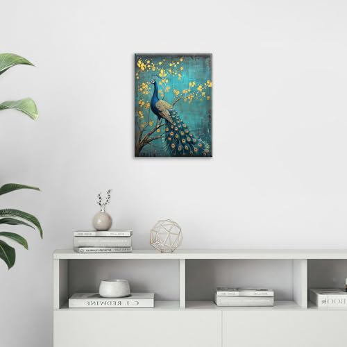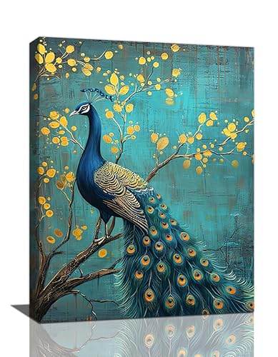 Gyeong - لوحة فنية جدارية بتصميم طاووس بلون أزرق مخضر، لوحة قماشية مطبوعة بنمط طائر ملون وأوراق نباتية ذهبية، عمل فني مرسوم لتزينن المنزل وغرفة النوم والحمام وغرفة المعيشة، مقاس 30 × 40 سم