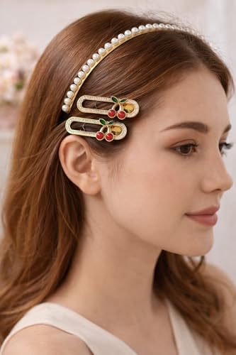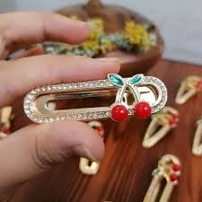 - تصميم الكرز الساحر: مشابك الشعر مزينة بحبات الكرز الحمراء والأوراق الخضراء مع تفاصيل من الكريستال اللامع على قاعدة ذهبية اللون لمظهر أنيق وجذاب