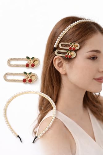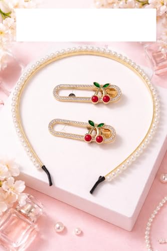 - طقم إكسسوارات شعر أنيق: يتضمن طوق شعر مزين باللؤلؤ بتصميم كلاسيكي مع زوج من مشابك الشعر المزخرفة بالكرز لإطلالة متكاملة وعصرية