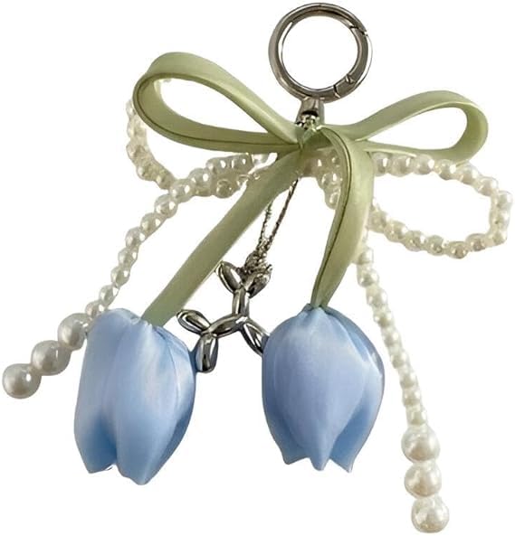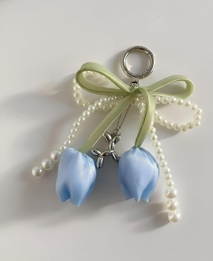 Generic - ميدالية مفاتيح بتصميم لؤلؤ وشريط ساتان أخضر، زينة حقيبة بألوان البيبي بلو، إكسسوار أنيق مع قلادة معدنية وزهور للسيدات