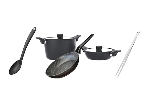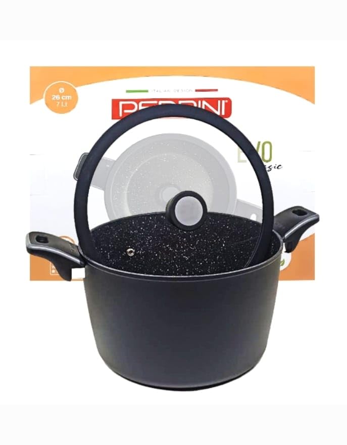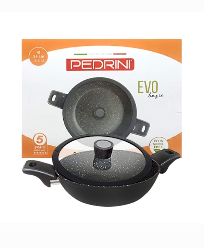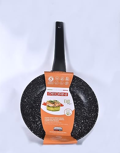 PEDRINI - طقم أواني للطهي جرانيت ايفو مقاوم للالتصاق من 5 قطع حلة 26 - منخفضة 24 - طاسة قلي + هدية معلقة نايلون بيدريني ومساكة طعام ستانلس ستيل