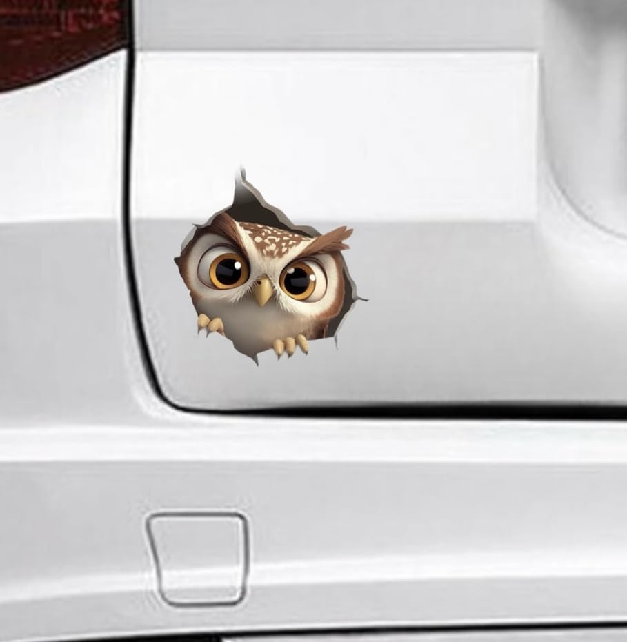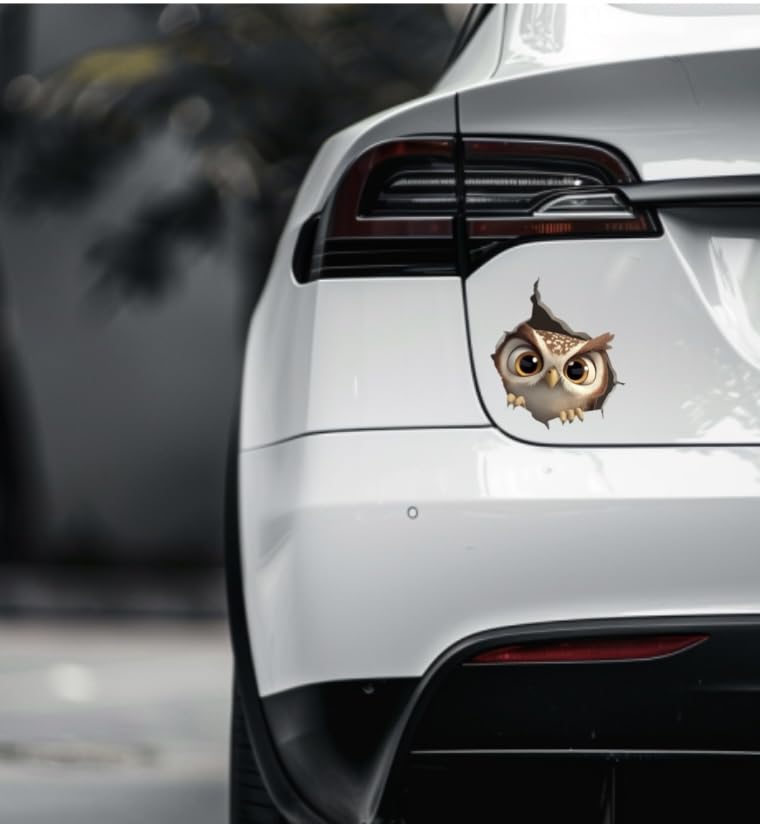 - مصمم ومطبوع من قبل ماكتيم، ويتميز بشكل بومة كرتوني لافت للنظر تنظر بطريقة مرحة، مما يجعله مثاليًا للزجاج الخلفي أو الصدامات.