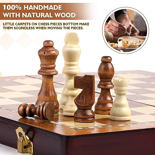 - قطع شطرنج منحوتة يدويًا: كل قطعة شطرنج منحوتة يدويًا من خشب صلب عالي الجودة. يبلغ ارتفاع الملك 3 انش (7.62 سم)، 2 مجسم شطرنج إضافي للنساء. الجزء السفلي مغطى بلباد رقيق لتجنب الخدش على سطح اللوحة وله تأثير هادئ. يتم إرفاق كل شطرنج في فتحة ايفا للحفاظ على ترتيب الشطرنج.