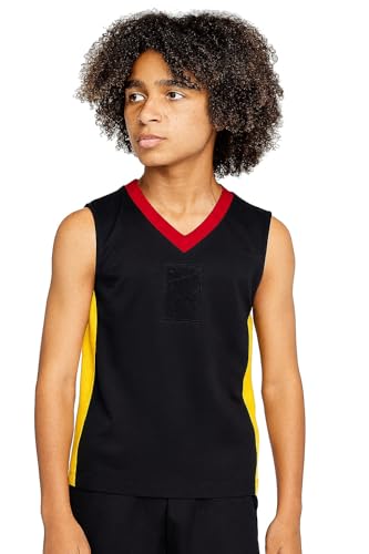 Perfect Fashion - تي شيرت رياضي بدون اكمام برقبة على شكل حرف V من بيرفكت فاشن، اسود مع حواف حمراء وألواح جانبية صفراء، ملابس رياضية للاداء الرياضي
