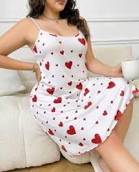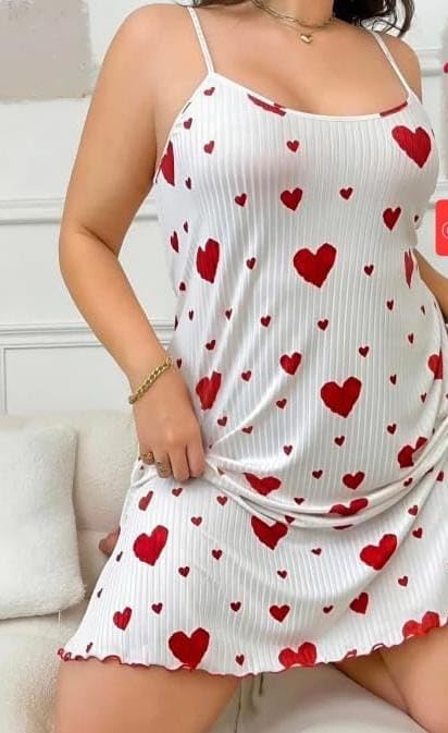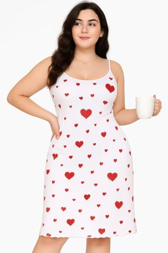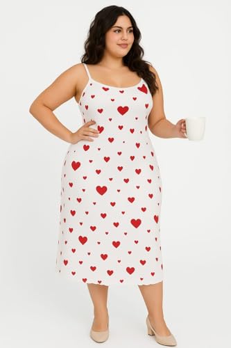 Perfect Fashion - قميص نوم بمقاس كبير مطبوع عليه قلب من بيرفكت فاشن، ابيض مع قلوب حمراء، ملابس نوم متوسطة الطول بحمالات رفيعة حتى 70 كجم - L282