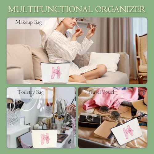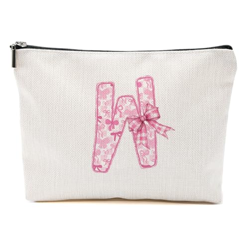 MQBMQB - شنطة مكياج بتصميم مخصص بحروف الاولى من الاسم، شنطة مستحضرات تجميل مع سحاب هدايا عيد ميلاد للنساء والفتيات، بينك فيونكة، 9.62 × 7.42 انش، W
