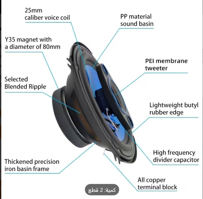 - مواصفات الطاقة: سماعات سيارة بقدرة قصوى 500 واط مع مقاومة 4 أوم لتقديم صوت قوي وواضح داخل السيارة