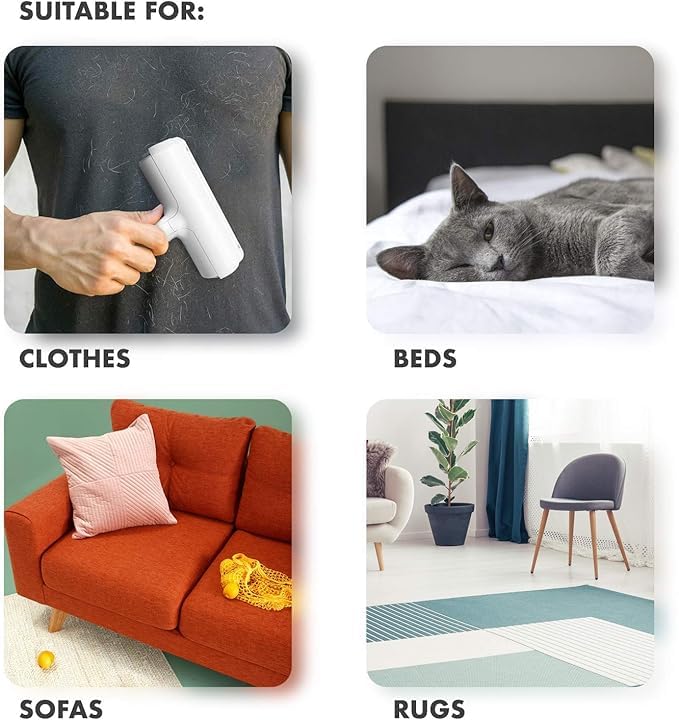 - أي مادة - استخدمها أينما تنتشر تلك الشعيرات المزعجة واللزجة! يمكن استخدامه بسهولة على السجاد والوسائد والأرائك والسجاد والأسرة والستائر ومقاعد السيارة المصنوعة من القماش والمواد الاصطناعية المخملية والمزيد! (ملاحظة: أكثر صلابة بطبيعة الحال مع مواد ناعمة)