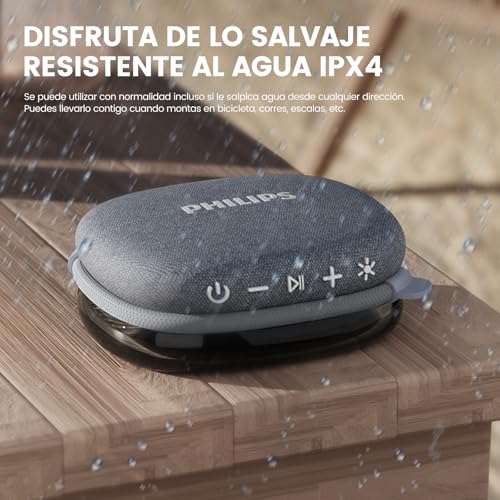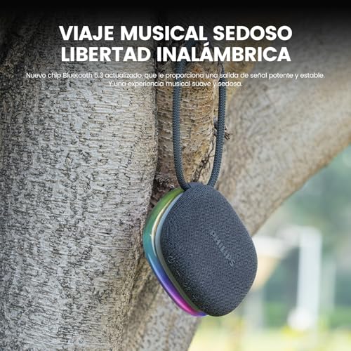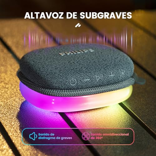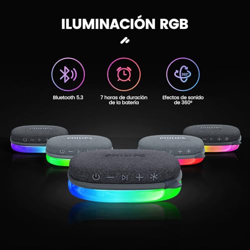 Philips - مكبر صوت محمول بلوتوث بالإصدار 5.3 مزود بإضاءة ار جي بي بزاوية 360° ومقاوم للماء بمعيار IPX4 لصوت ستيريو عالي الدقة HD مع بطارية 1500 مللي امبير للعمل حتى 7 ساعات لتشغيل الموسيقى مزود بسلك مخفي من