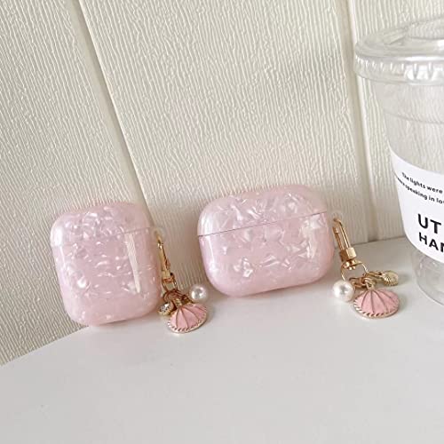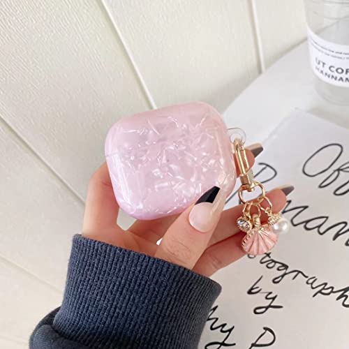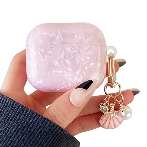 PHOEACC - جراب حماية لسماعات ايربود الجيل الثالث مصنوع من بولي يوريثين صلب مقاوم للحرارة بتصميم رخامي لطيف وفاخر مع سلسلة مفاتيح لامعة بشكل صدفة ولؤلؤ، للنساء والمراهقين والفتيات من فوياك (بينك)، زهري