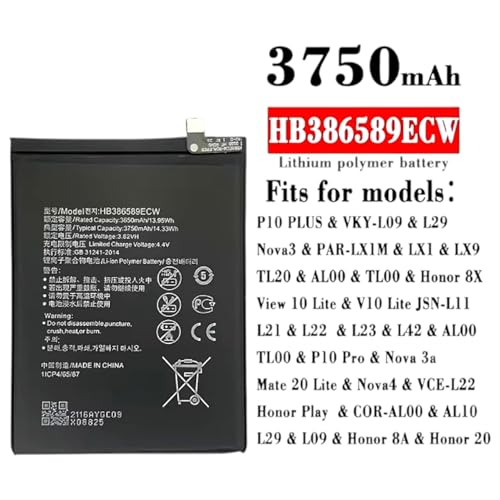 Generic - بطارية موبايل HB386589ECW (3750mAh) لهواوي P10 بلس هونر فيو 10 نوفا 3 3A 4 هونر بلاي 20 ميت 20 لايت 8A 8X L29 LX1 AL00 L21 ليثيوم ايون بوليمر بديل جديد