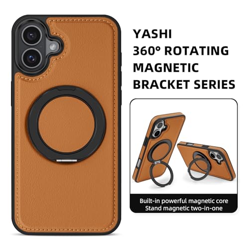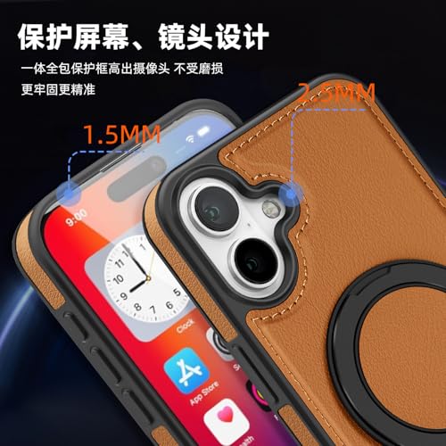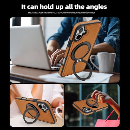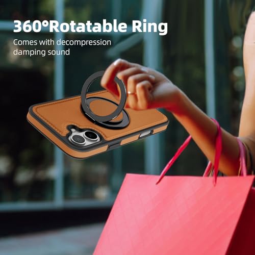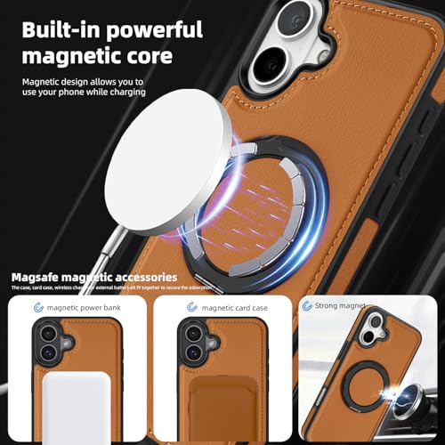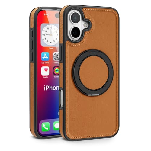 Generic - جراب حماية من الجلد الصناعي بتصميم عصري أنيق مع حلقة معدنية مغناطيسية للشحن اللاسلكي لموبايل آيفون 16 بلس (بني)