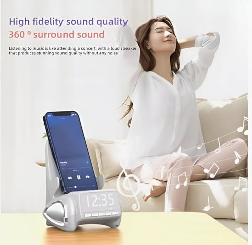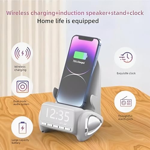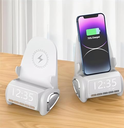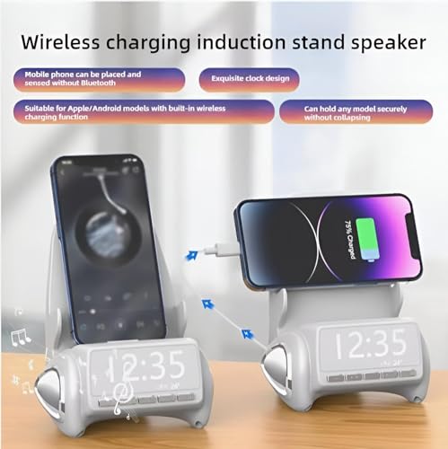 - يجمع هذا الجهاز المبتكر 5 في 1 بين شاحن لاسلكي ومكبر صوت بلوتوث وساعة رقمية ومنبه وحامل موبايل، مما يوفر حلاً متعدد الوظائف موفر للمساحة للمكاتب أو المنضدة مع تكامل سلس بين جميع الميزات.