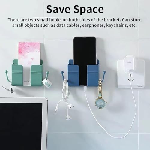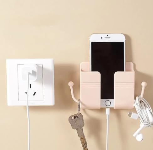 Generic - حامل موبايل ذاتي اللصق يثبت على الحائط وبها خطافين،حامل لغرفة النوم والمطبخ والمكتب ، متعدد الاغراض مع فتحة لشحن الجوال بها لاصق اللون عشوائي - قطعة 1