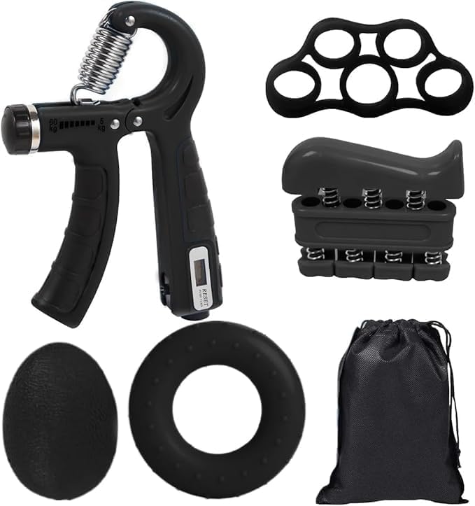 - مجموعة تدريب كاملة: مجموعة تقوية قبضة اليد المكونة من 5 قطع تتضمن مقوي اليد، ومدرب قوة القبضة، وقبضة الساعد مع مقاومة قابلة للتعديل، وممدد للأصابع، وممرن للأصابع