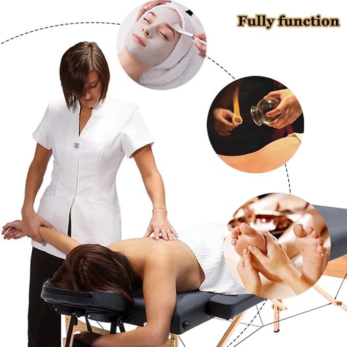 - تصميم قابل للتعديل: يتميز بأرجل قابلة لتعديل الارتفاع بزر ضغط، وسمك 6.5 سم قابل للتعديل والإزالة ومسند رأس إسفنجي عالي الكثافة ورف مسند الذراع وموسعات ذراع جانبية