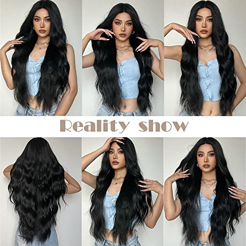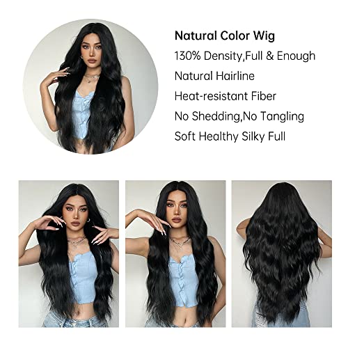 piaou - باروكة شعر طويل مموج باللون الاسود للنساء، باروكة شعر صناعي مموج ذو مظهر طبيعي، مقاوم للحرارة للارتداء اليومي وفي الحفلات - 28 بوصة (لون اسود)