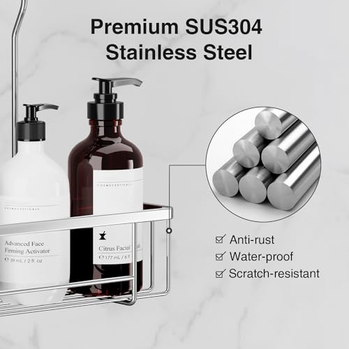 - ✔ مادة ممتازة - رف الدش مصنوع من الستانلس ستيل SS304 عالي الجودة ومطلي بالكهرباء ومطلي بالمسحوق، والذي لا يوفر حماية أفضل ضد الصدأ والخدوش فحسب، بل يوفر أيضًا الموثوقية ويمكنه حمل الحاويات الثقيلة بشكل أفضل من المواد الأخرى. قم بتعليق حامل الدش على صنبور الحمام الخاص بك لخلق مساحة تخزين إضافية مثالية للشامبو والبلسم وجل الاستحمام ورغوة الحلاقة وأكثر من ذلك، واستمتع بدش خالٍ من الإجهاد!