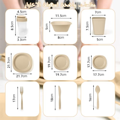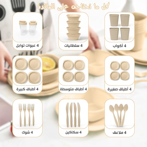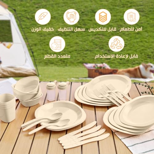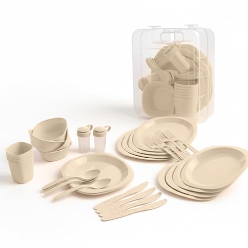 Generic - مجموعة أدوات مائدة للرحلات مكونة من 35 قطعة مع ملاعق وشوك وسكاكين وبولات وأكواب، صندوق تخزين محمول، منظم طعام للنزهات والسفر والتخييم، سهلة التنظيف (لون بيج)